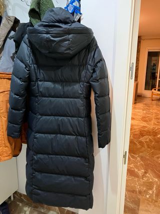 Abrigo largo negro con capucha, dos bolsillos y cremallera doble para abrir por arriba y por abajo. Es un abrigo fantástico, de muy buena calidad, con un diseño que realza la figura y que combina con todo. Está poco usado porque melo regalaron y me quedé embarazada.
