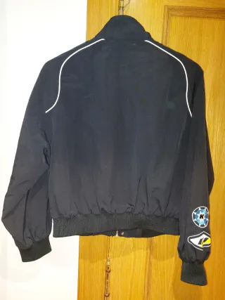 Cazadora de Aston Martin by Hackett en color negro. Presenta un diseño moderno y deportivo, con capucha desmontable. La talla es una XL justa, equivalente a una talla L amplia. - Logo de Aston Martin Racing bordado en rojo en el pecho. - Cierre de cremallera frontal. - Bolsillos laterales con cremallera. - Cuello redondo con cierre de botón. - Puños y bajo elásticos.