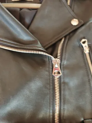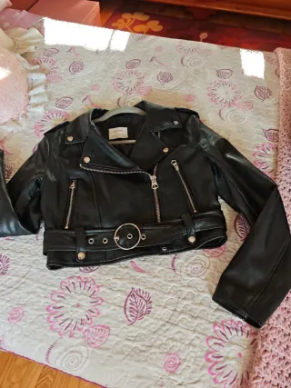 Cazadora estilo biker confeccionada en polipiel.Color negro.Lleva cinturón.Esta sin estrenar Talla M.Bershka. - Diseño con múltiples cremalleras. - Cinturón con hebilla metálica. - Cuello solapa con botones a presión.
