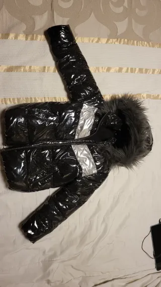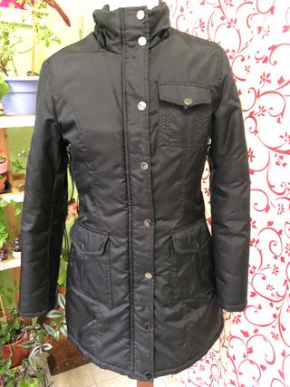 Abrigo tipo parka impermeable en color negro. Cuenta con capucha ajustable, cierre de cremallera, bolsillos frontales de solapa con botón. Está nueva, me la he puesto dos veces pero me confundí con la talla y me queda estrecha en los hombros. Es muy calentita y cómoda.