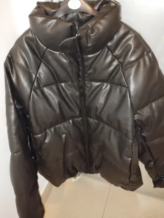 Abrigo acolchado de polipiel en color negro. - Diseño moderno y acolchado. - Cuello alto. - Cierre de cremallera frontal. Un solo uso.