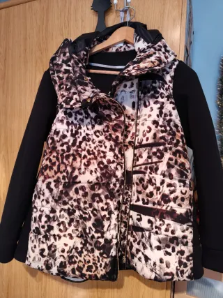 Cazadora con un llamativo estampado de leopardo en la parte delantera y mangas de color negro. - Diseño acolchado en el torso. - Cremallera frontal dorada. - Cuello alto con capucha.