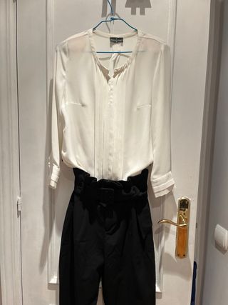 Elegante conjunto de prendas. - Abrigo color beige de lana - Pantalones negros, cintura alta y fruncida -blusa blanca elegante