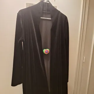 Chaqueta, tipo sobretodo, en terciopelo negro. Muy cómoda y ligera. Un solo uso (me queda pequeño), en perfecto estado. Poliéster con elasthan. Ĺargo 98cm, hombros aprox. 39cm, axila a axila unos 47cm. No tiene cierre.