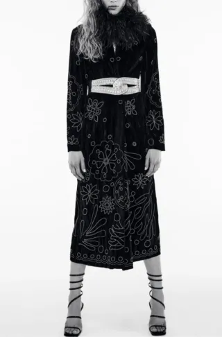 Elegante chaqueta de Zara con detalles bordados y flecos. - Diseño abierto. - Mangas 3/4. - Adornos bordados en puños y bajo. - Flecos decorativos en los bordes.