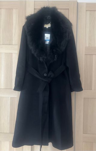 Abrigo de lana negro muy elegante, calentito y versátil. Temporada Invierno 2025. Todavía está en venta en la web. Puede cerrarse con botonadura simple o con cinturón para ajustar la silueta incorpora prácticos bolsillos laterales y un cuello con ribete de pelo sintético extraíble. Fue un regalo a mi mujer y le queda grande. Talla XL pero corresponde a 46 grande. • 58 % lana