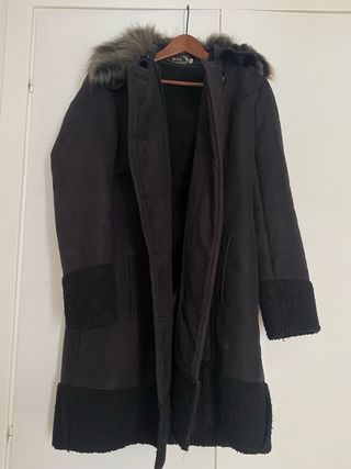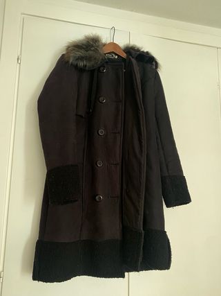 Abrigo tipo trenca en color negro, muy elegante y calentito. Lleva capucha con pelo (muy bonito y en buen estado), cierre con cremallera y botones tipo trenca en la parte delantera. Tiene bolsillos amplios y es ideal para invierno, tanto para el día a día como para ocasiones más arregladas. Es cómodo, abriga bastante y queda muy favorecedor puesto.
