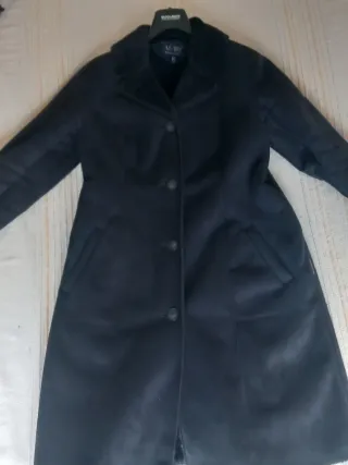 Elegante abrigo de Armani Jeans en color negro. - Diseño clásico con cuello. - Cierre de botones. - Bolsillos frontales. - Talla 44, pero es más pequeña (ver fotos)