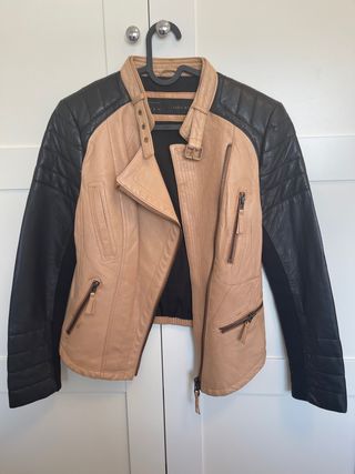 Chaqueta de piel con diseño bicolor. - Mangas y hombros en negro. - Cuerpo principal en color beige. - Cierre asimétrico con cremallera. - Bolsillos frontales con cremallera. (Talla pequeña, pone que es M pero no corresponde con las tallas actuales porque es ajustada )