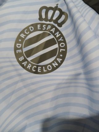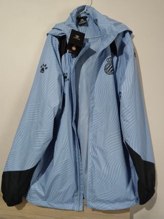 Cortavientos oficial del RCD Espanyol de Barcelona, marca Kelme. Diseño moderno y ligero. - Color azul con detalles en negro. - Logo del RCD Espanyol en el pecho. - Logo de Kelme en la manga.