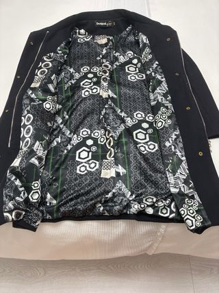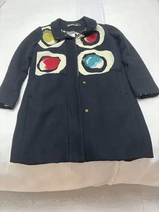 Elegante abrigo de la marca Desigual con un diseño texturizado. - Patrón de escamas en relieve. - Cierre de botones. - Cuello amplio. Hay un botón en la manga roto pero dentro tiene uno de repuesto