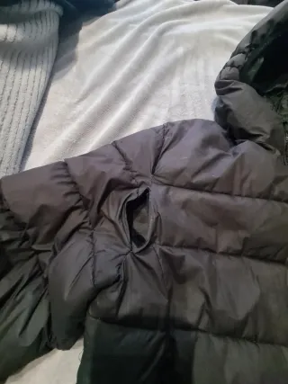 Abrigo acolchado grueso, perfecto para el frío. Cuenta con capucha y bolsillos frontales. - Diseño acolchado horizontal. - Cierre de cremallera. - Puños y cuello interiores negros. - Tiras decorativas en las mangas. Talla XS o de niños de 14 años Prácticamente solo se ha usado 2 veces, es decir, que está nuevo