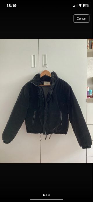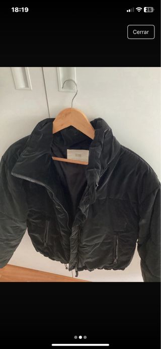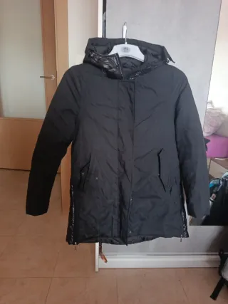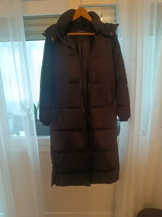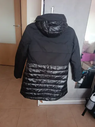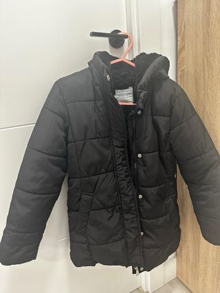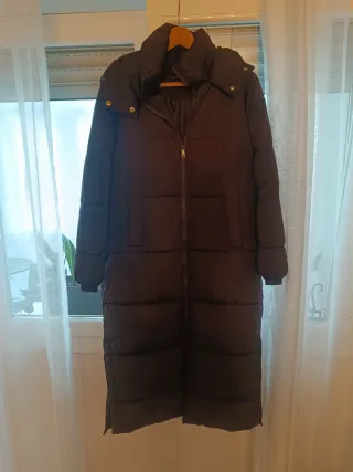 Abrigo largo de la marca ZARA en color negro. Es una talla s pero la veo un poco amplia - Diseño acolchado. - Con capucha. - Cierre de cremallera.