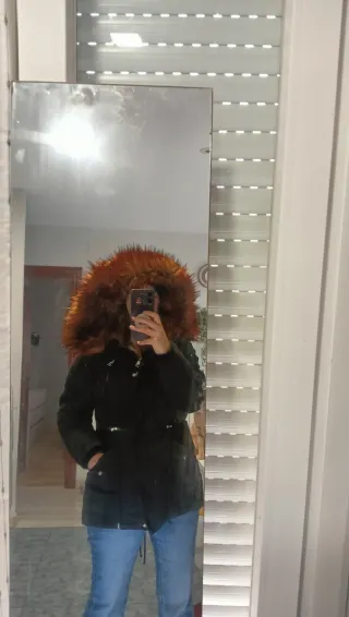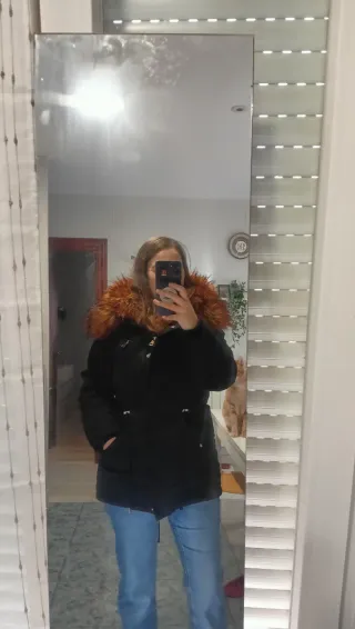 Abrigo de invierno con un diseño moderno y cálido.Precio negociable - Capucha con borde de pelo sintético. - Forro interior de color rojo. - Cierre de cremallera frontal. - Bolsillos laterales con cremallera.