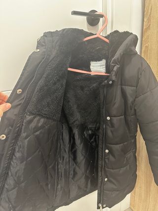 Abrigo negro con detalles modernos y capucha de pelo ,muy abrigado ,apenas uso ya que se le quedó pequeño enseguida. talla 12/13años amplio, comprado en Jd - Cierre de cremallera frontal. - Bolsillos con cremallera en el pecho. - Bolsillos de solapa en la parte inferior. - Puños y bajo elásticos.