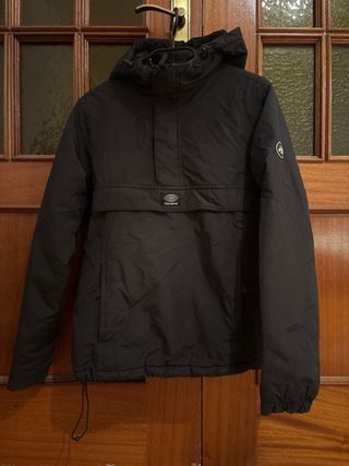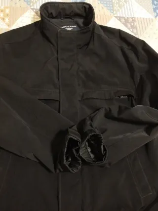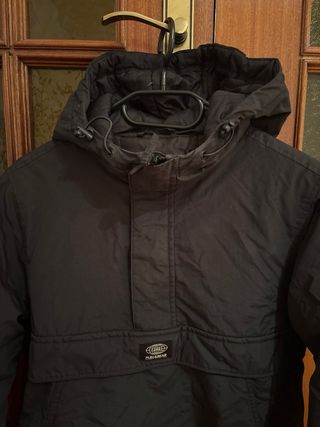 Cazadora Dockers en color negro. Con cierre de cremallera y botones. Cuello alto y bolsillos frontales. Tiene un forro interior que la hace calentita. Está usada pero se conserva muy bien.