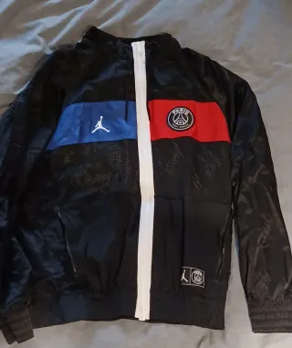 Cortavientos deportivo con diseño moderno. - Paneles de color azul y rojo. - Logo de Jordan y escudo del Paris Saint-Germain. - Cremallera frontal blanca. - Bolsillos laterales.