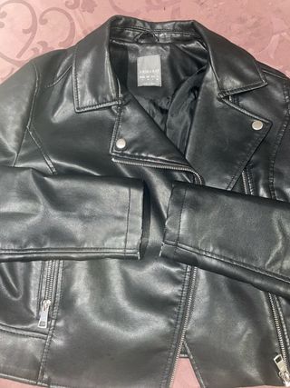 Chaqueta negra de estilo motero, ideal para añadir un toque moderno a tu armario. Confeccionada en material sintético. - Cierre de cremallera frontal. - Bolsillos con cremallera. Lo único que está desgastado en las mangas como podrá ver en las fotos