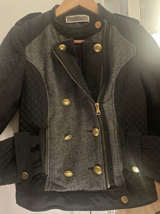 Abrigo de Stradivarius con un diseño moderno y elegante. - Combinación de tejido gris con detalles acolchados en negro. - Cierre cruzado con botones dorados. - Bolsillos frontales con cremallera.( bolillo derecho por dentro tiene un hueco)