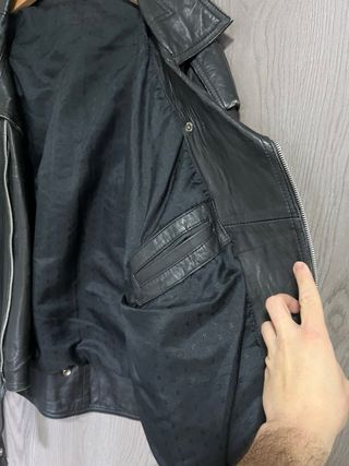 Chupa de cuero negra con flecos, no pone talla, es una L o XL, mido 1,80 y me queda bien, no pone marca, está desgastada y con agujeros, bastante ligera y cómoda con un bolsillo interior. Precio negociable.