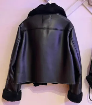 Cazadora estilo biker con forro interior de pelo. - Cuello con solapas y detalle de pelo. - Cierre de cremallera asimétrica. - Puños con acabado de pelo.