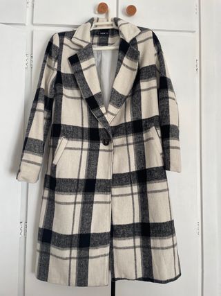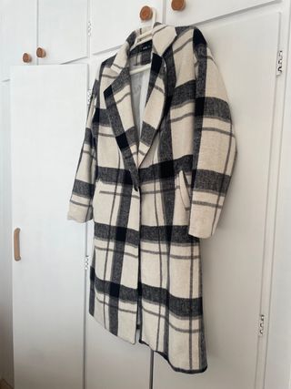 abrigo largo de paño de cuadros color blanco y negro
