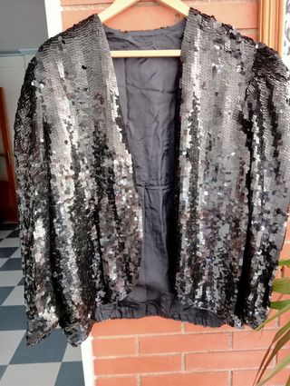 bonita chaqueta de lentejuelas negra sin botones la parte de adelante está redondeada muy bonita ,