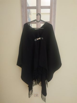 Elegante capa tipo manta, perfecta para añadir un toque de estilo a tu atuendo. - Cierre frontal con broche. - Diseño con flecos en el bajo.