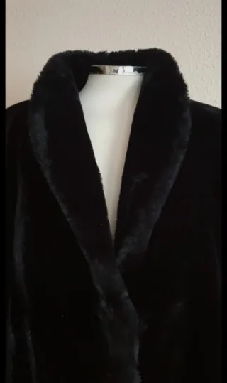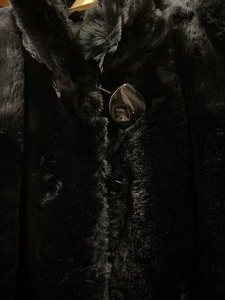 Abrigo de pelo ( estilo mouton ) en color negro. Dos botones delanteros y dos bolsillos. Forrado interiormente. Puesto dos veces. Largo : 84 cm