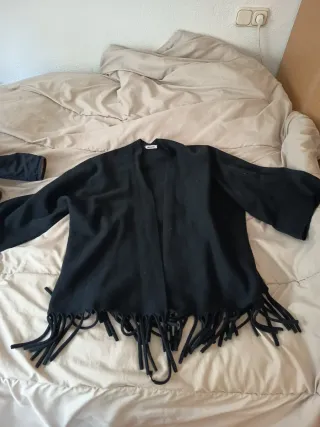 Capa tipo poncho en color negro, con un diseño moderno y detalles de flecos. - Diseño abierto. - Flecos decorativos en el borde.