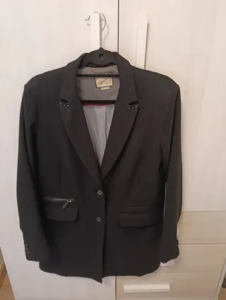 Elegante abrigo negro con detalles modernos. - Cierre de un botón. - Bolsillos frontales con cremallera. - Solapas con detalle de tachuelas.