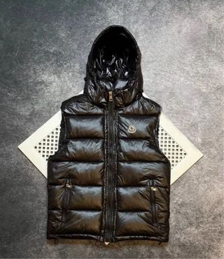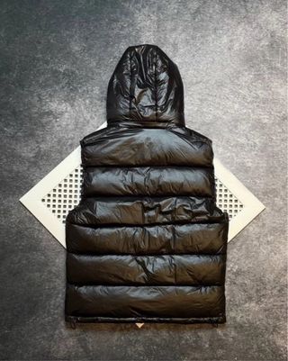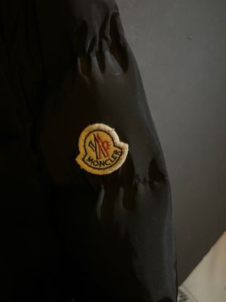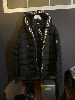Chaqueta Moncler de color negro con detalles de logo en la capucha. - Diseño acolchado. - Cremallera frontal. - Logo de Moncler en la manga.
