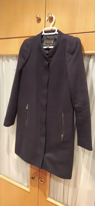Abrigo de paño con un diseño flojo y elegante. Abrigo en color azul/negro Medidas: 40 cm de espalda, 48 cm de sisa a sisa. 87 cm de largo.