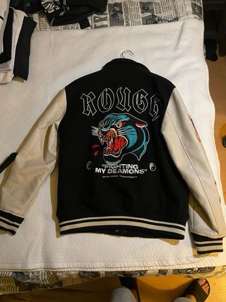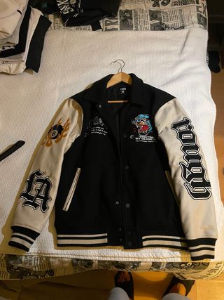 Chaqueta estilo varsity con un diseño llamativo. Chaqueta pesada - Mangas de color beige. - Cuerpo principal en color negro. - Detalles bordados en mangas y pecho. - Cuello, puños y bajo con rayas.