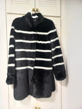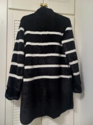 Abrigo de pelo sintético con un diseño de rayas horizontales. - Diseño de rayas en blanco y negro. - Tacto suave y cálido. - Cuello redondo.