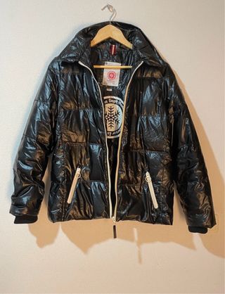 Plumas negro en buen estado. - Diseño acolchado. - Cremallera frontal. - Capucha. - Bolsillos con cremallera.