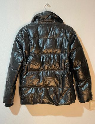Abrigo largo oversize acolchado de efecto piel negro de Zara. Se caracteriza por su diseño acolchado con patrón de rombos y su acabado brillante similar al cuero. Talla M ( al ser oversize sirve para cualquier talla)