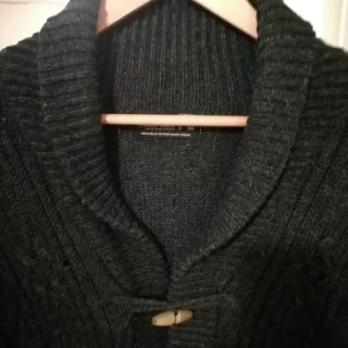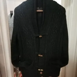 Chaqueta larga de punto con un diseño trenzado muy característico. Cierre de botones de madera y termina en dos botones. -Muy cómoda y abrigadita. -Es una S, pero da talla. Es grande irá. - Cuello tipo chal. - Bolsillos laterales.