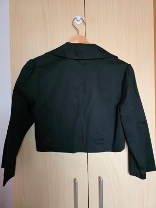 Torera negra elegante y versátil. - Diseño corto. - Mangas francesas. - Cuello solapa con un botón para abrochar.