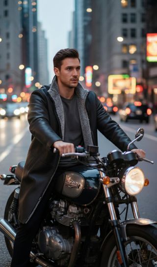 Elegante abrigo negro para hombre, con un diseño moderno y versátil. - Cuello alto con detalle de tejido gris. - Cierre frontal con cremallera. - Bolsillos laterales. - Material exterior tipo piel.