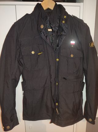 Chaqueta de moto de color negro, ideal para cualquier temporada. - Cierre frontal con cremallera y botones a presión. - Múltiples bolsillos con solapa y botón. - Cuello alto con cierre ajustable. - Detalles de insignias en la manga y el pecho.