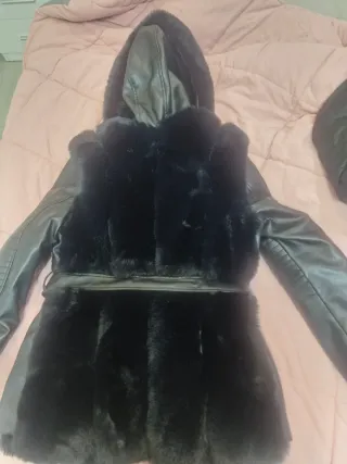 Elegante abrigo con detalles de pelo sintético y mangas de cuero. -Sin estrenar - Diseño con cinturón. - Capucha con pelo. -tallá S -me costó 70
