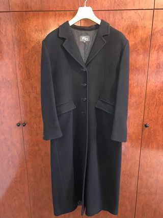 Elegante abrigo largo de la marca Yera. - Diseño clásico y atemporal. - Cierre frontal con botones. - Bolsillos laterales. - Cuello solapa. Se entrega lavado en tintorería. Pone talla 46, pero parece que viene pequeña. Preguntar medidas sin compromiso.