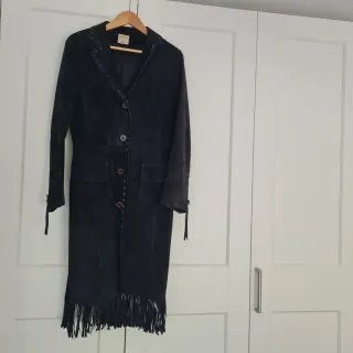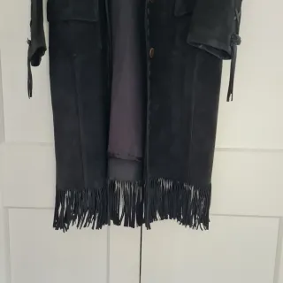 Abrigo negro de napa con flecos - Diseño con botones frontales. - Bolsillos en la parte delantera. - Mangas con detalle de lazada y flecos.