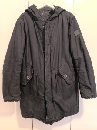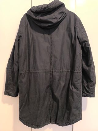Parka de la marca Cheap Monday, modelo CAGE PARKA, en color negro y talla M. Diseño sueco. - Capucha integrada. - Cierre de botones a presión y cremallera. - Dos bolsillos frontales con solapa y ojales metálicos. - Cordón ajustable en la cintura.