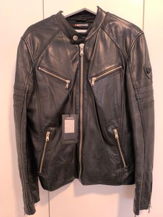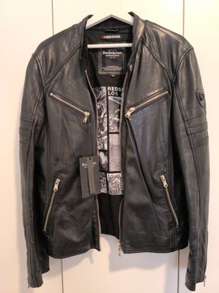 Chaqueta de cuero estilo motero de la marca Redskins. - Diseño con cuello mao y cierre de cremallera. - Múltiples bolsillos frontales con cremallera. - Detalle de cremalleras en los puños. - Parche con logo en la manga.