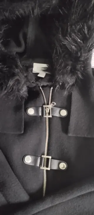 Abrigo negro con capucha y detalle de pelo. - Capucha con pelo sintético. - Cierre de cremallera y botones. - Bolsillos laterales.