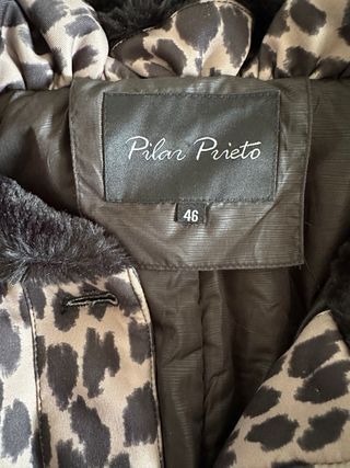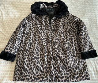 Abrigo con un llamativo estampado de leopardo y detalles de pelo sintético. - Diseño elegante y original. - Puños y cuello con pelo sintético negro. - Cierre de botones. - Bolsillos frontales. - Talla 46. - Está prácticamente nuevo.