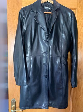 Abrigo negro entallado de polipiel. - Diseño moderno y elegante. - Cierre de botones. - Cuello de solapa. -Buen estado