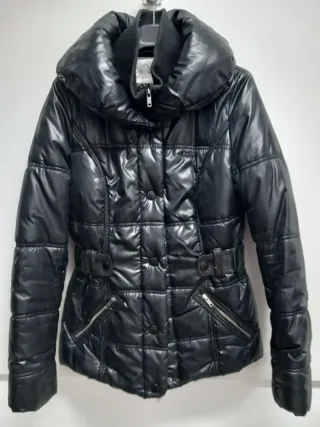 Sin usar. Abrigo negro brillante con un diseño acolchado. - Cremallera frontal. - Cuello alto. - Puños elásticos.